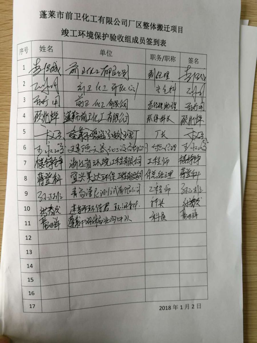 蓬萊市前衛(wèi)化工有限公司廠區(qū)整體搬遷項目竣工環(huán)境保護驗收簽到表